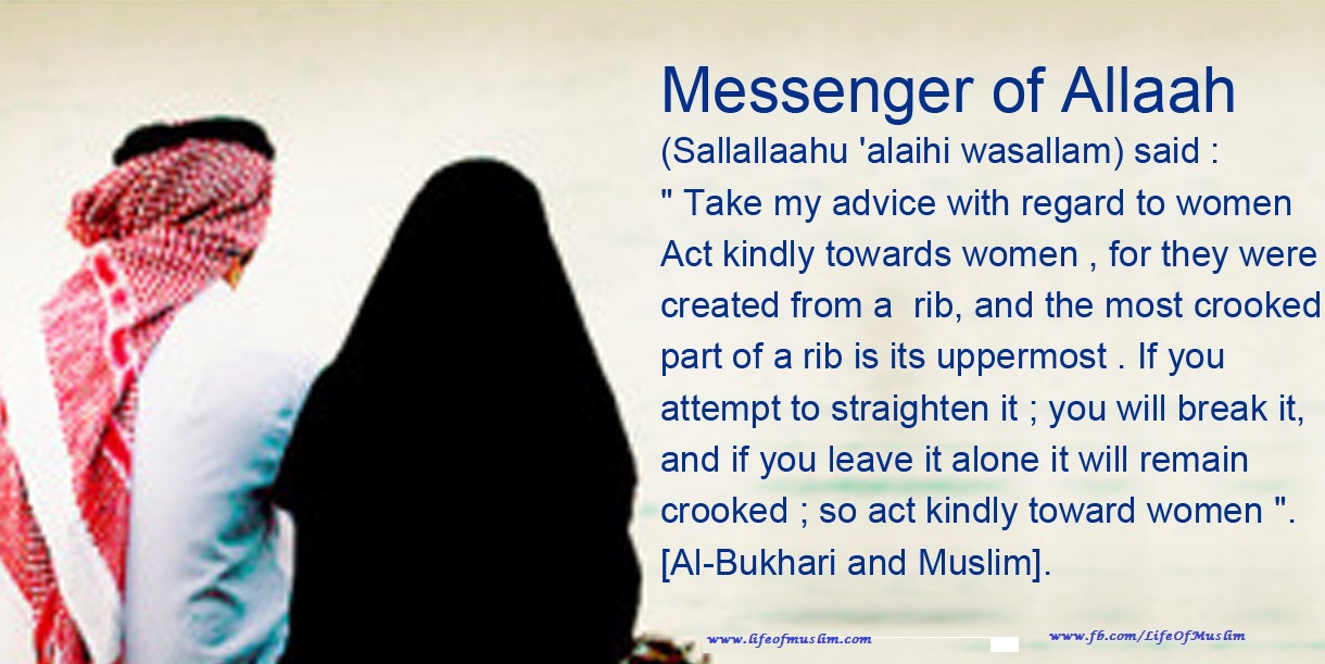“Take my advice with regard to women, Act kindly towards women, for they were created from a rib, and the most crooked part of rib is its uppermost. If you attempt to straighten it; you will breake it, and if you leave it alone it will remain crooked. So, act kindly toward women.”