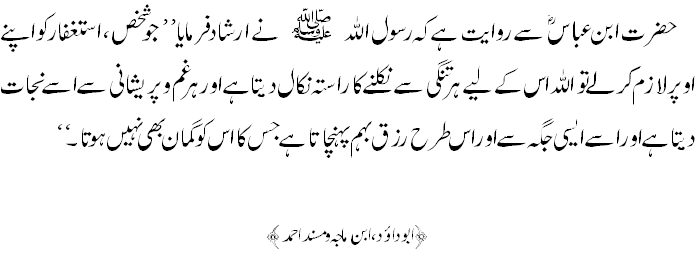 Jis Ne Astaghfar Ko Apny Upar Lazim Kar Lia Life of Muslim December 28, 2011 Islam Life of Muslim Jis Ne Astaghfar Ko Apny Upar Lazim Kar Lia, ALLAH Ta’ala Us Ki Har Pareshani Dor Farmay Ga. Har Tangi Se Usay Rahat Ata Farmay Ga, Aur Usay Aisi Jagah Se Rizq Ata Farmay Ga, Jaha Se Usay Guman Bhi Na Hoga. You May Also Like:Mazi Nikalnye Se Wazoo Lazim Ata Hai Gusal Zarrori NahiAstaghfar Ko Apna Wazefa Bana LoHusnay Ikhlaq Se Bar Kar Mezaan Mai Bhari Cheez Koi Nahi Ho…Jo Aurat Khushbu Laga Kar Bahar Nikalti Hai Aur Uski KhushbuKHUBSOORTI ki kami ko ikhlaq pura kar sakta haiSADQA De Kar ALLAH Se TIJARATOr ALLAH Hi Hai Jis Ne Aasman Or Zameen Ko Haq Ke Sath Paida…Jis Muashrey Mein Nikah Mushkil Bana Diya Jaey Wahan Zana…Jis Momin Ko Bura Bhla Ya Gali Di Ho, Us Ke Liye DuaJis Moot Se Tum Bhagtay Ho, Wo Zarror Tumhay Milnay Wali Hai