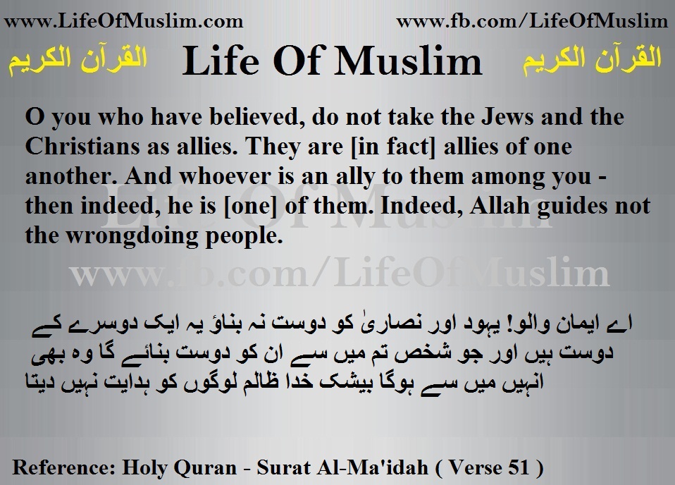 اے ایمان والو! یہود اور نصاریٰ کو دوست نہ بناؤ یہ ایک دوسرے کے دوست ہیں اور جو شخص تم میں سے ان کو دوست بنائے گا وہ بھی انہیں میں سے ہوگا بیشک خدا ظالم لوگوں کو ہدایت نہیں دیتا