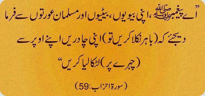 اے پیغمبر اپنی بیویوں اور بیٹیوں اور مسلمانوں کی عورتوں سے کہہ دو کہ (باہر نکلا کریں تو) اپنے (مونہوں) پر چادر لٹکا (کر گھونگھٹ نکال) لیا کریں۔ یہ امر ان کے لئے موجب شناخت (وامتیاز) ہوگا تو کوئی ان کو ایذا نہ دے گا۔ اور خدا بخشنے والا مہربان ہے