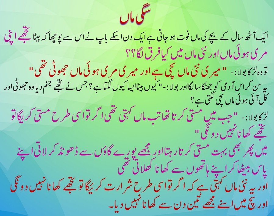 تو وہ لڑکا بولا:- ” میری نئی ماں سچی ہے اور میری مری ہوئی ماں جھوٹی تھی”